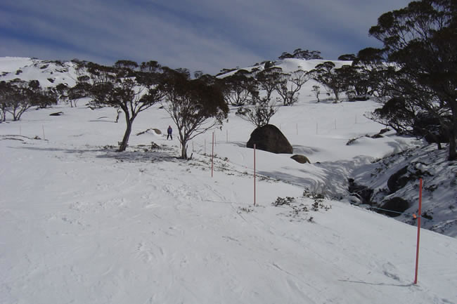 Ski Trip to Perisher Blue, New South WalesHalf way down the Pretty Valley run is a beautiful creek with the water tumbling out beneath the thawing ice and snow. This photo didn't quite pick up on that but you get the idea. Yes, that is me posing in the backing! Previous | Album | Next |