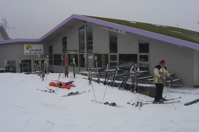 Ski Trip to Perisher Blue, New South WalesBack 'home' for lunch. Quite a few have popped in for lunch or a break by the look of the skis piled up outside. Pete & I shared a bowl of hot chips and a drink at the bar then headed out to tackle the slopes again. [Oh and did I mention smearing Dencorub on my knee and popping a couple of Nurofen... getting old!] Previous | Album | Next |