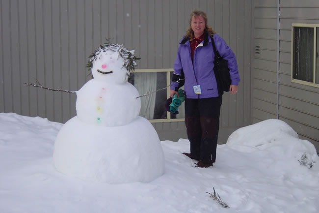Ski Trip to Perisher Blue, New South WalesSome kids staying at the hotel built a great snowman out back of the Sundeck. Why reinvent the wheel I say, so we adopted it for a photo. You can see one of the ground floor bedroom windows behind - below snow level! Glad we were on the second floor in a "mountain view" room. Slightly more expensive but worth it I think. Previous | Album | Next |