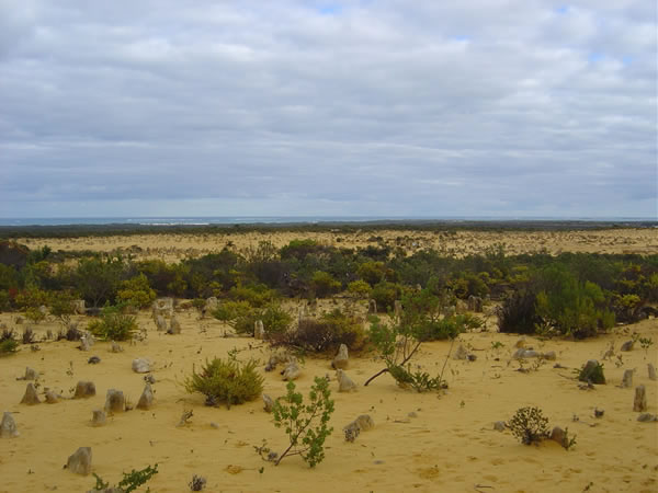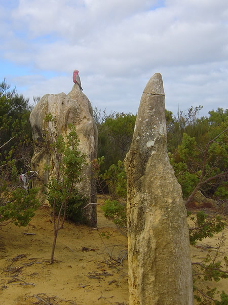 The Pinnacles, Nambung National ParkFrom the lookout you can see Nambung National Park extends all the way to the coast. Can you spot the emus in the middle of this photo? They are well camouflaged. There were also a lot of birds in the park including these pink galahs. Previous | Album | Next |