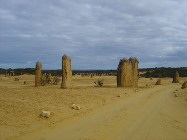The Pinnacles, Nambung National ParkThe pinnacles were once a layer of soft limestone cemented together by the lime leaching from the sand dissolved by rain. This rock layer had a hard layer of calcrete on top to protect it. You can still see the white calcrete on top of these pinnacles. Cracks in the calcrete were pushed apart by plant roots allowing the soft limestone to erode away. The surrounding sands have blown away leaving only the the most resilient limestone under the protective calcrete - the pinnacles. Previous | Album | Next |
