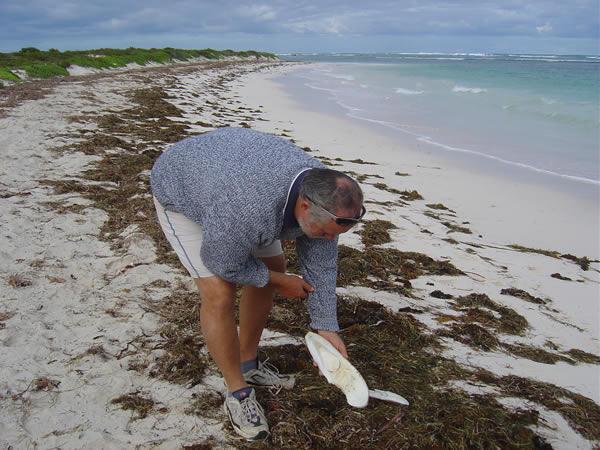 Nambung National ParkJust a bit further north of Hangover Bay we stopped at Kangaroo Point. It is another loevly beach popular for shore fishing and boating. Pete picked up one of the many large cuttlefish shells laying on the beach. They are amazing! Previous | Album | Next |