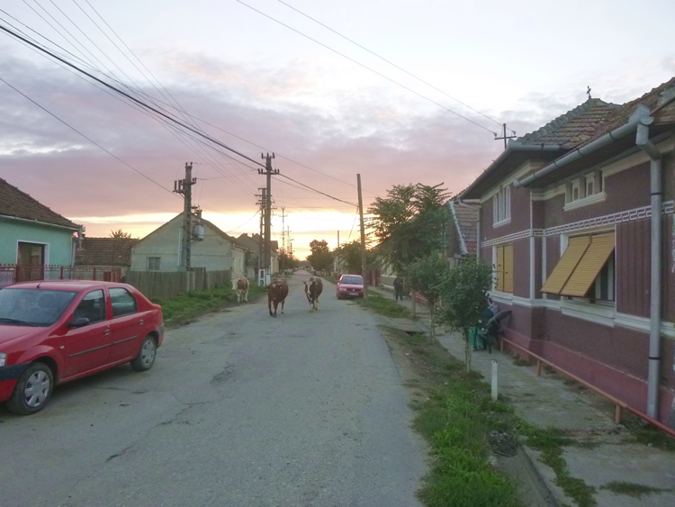UK and Europe Roadtrip - OrastieThis street, complete with cows being herded by an old man, was just outside our campground. As it got dark we headed back in for a beer with our host. Select the photo below to see more of our campsite as the sun set over the town of Orastie. Previous | Album | Next |