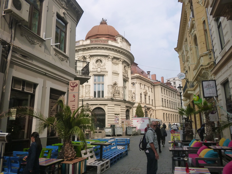 We wandered down some narrow lanes nearby and found a cafe for a well earned break. Select the photo below to see the old building housing the Romanian National Bank built in 1890.