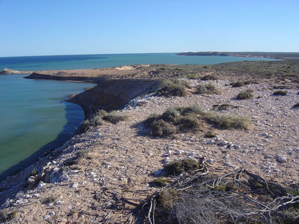 Shark Bay, Peron PeninsulaFrom Eagle Bluff walkway you can see along the cliffs to Denham in the distance 20km north. The boardwalk has information stations that explain why Shark Bay has such a high salt concentration leading to the unusual marine life it sustains. This area has the world's largest seagrass banks which dugong love. We didn't see any here though. Previous | Album | Next |