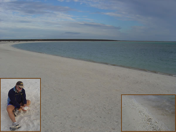 Shark Bay, Peron PeninsulaIt was a bit dull and overcast so the photo didn't do justice to this snow-white Shell Beach made up of millions of tiny heart cockle shells. These are high salt tolerant so can flourish in these hyper-saline waters where other shells cannot. Previous | Album | Next |