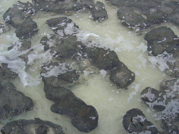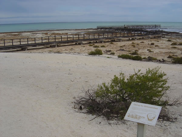 Shark Bay, Peron PeninsulaA board walk has been constructed to protect the stomatolites growing up to the high tide mark in Hamelin Bay. They look like living rocks - have a closer look. Living microbes build the stromatolites which are one of the earliest lifeforms known. Stromatolites are only found in a couple of places on Earth. Previous | Album | Next |