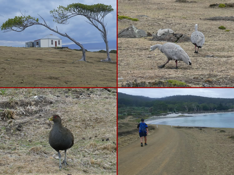 Tasmania Roadtrip - Week 7 - Maria IslandWe passed Ruby Hunt's Cottage built in the early 1900s (note the wind affected trees here), plenty of Cape Barren Geese and black Tasmanian native hens called 'turbo chooks' as they are flightless but run very fast. It is an interesting 2.5 hour return walk to the Painted Cliffs. Previous | Album | Next |