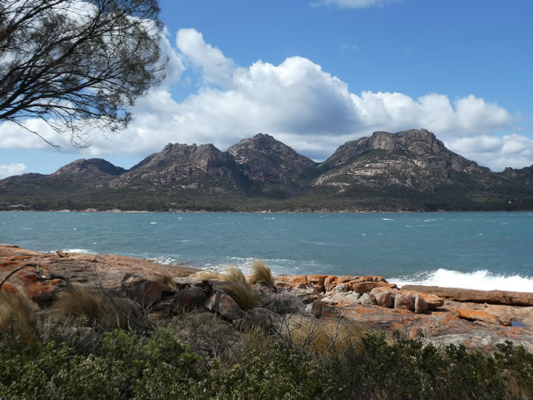 Tasmania Roadtrip - Week 7 - The HazardsOur first stop was at Coles Bay where we had tremendous views across to The Hazards mountain range. The same beautiful blue water and red coloured rocks just add to the picture. The Wineglass Bay walking track starts near the base of those pink granite mountains. Previous | Album | Next |