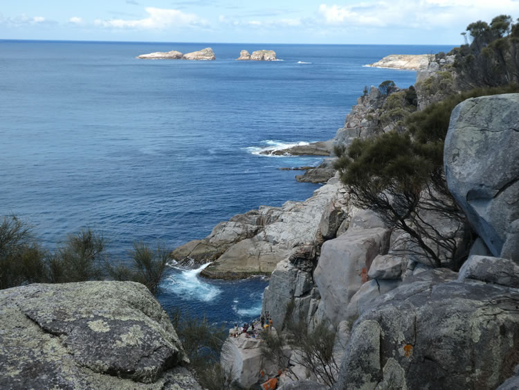 Tasmania Roadtrip - Week 7 - FreycinetWhitewater Wall is popular with those who want to rock climb, abseil or go highlining between these spectacular sea cliffs. We had never seen highlining before so we clambered down to some rocks for a better view. At the bottom of this photo you can see them setting up their ropes. Previous | Album | Next |
