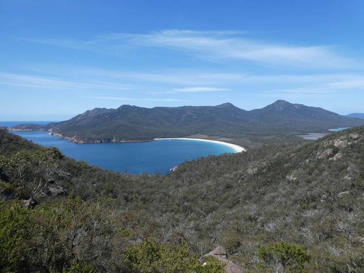 Tasmania Roadtrip - Week 7 - Wineglass BayAs we approach the Wineglass Bay Lookout we get a good look at The Isthmus with the white sands of Wineglass Bay on one side and Hazards Beach on the other. That is Mt Freycinet in the distance. You can choose to take the track back to the carpark from here or continue down to the beach. Previous | Album | Next |