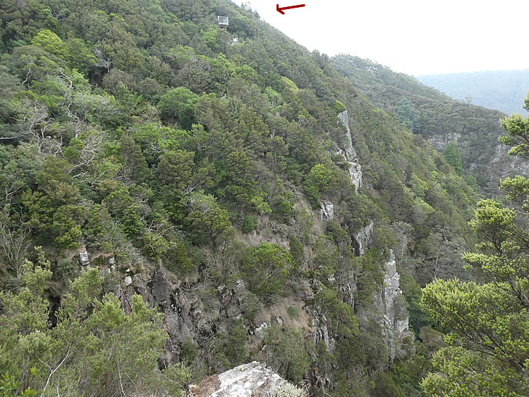 Tasmania Roadtrip - Week 8 - Ralphs FallsI carefully made my way out closer to the edge of the escarpment where the creek topples over the rocks creating Ralphs Falls. I didn't go too close as it is a pretty scary drop! The red arrow shows where we were a short time ago looking across from the Lookout. It was definitely worth the drive here. Previous | Album | Next |