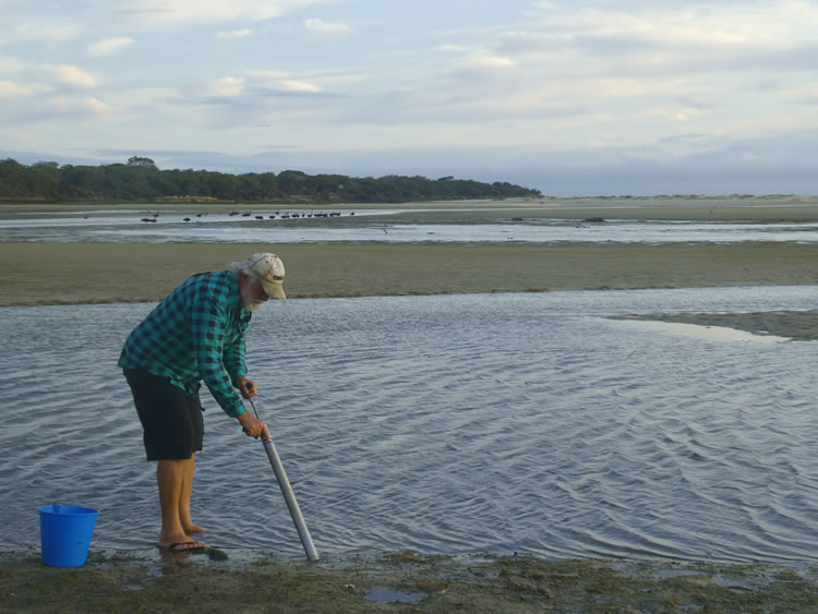 Tasmania Roadtrip - Week 8 - Little MusselroeOur neighbours lent us a yabbie pump so we were able to get some fresh bait while the tide was out in Little Musselroe River. You can see the boat ramp across the tidal flats and the ocean in the distance. The swans love it here. Previous | Album | Next |