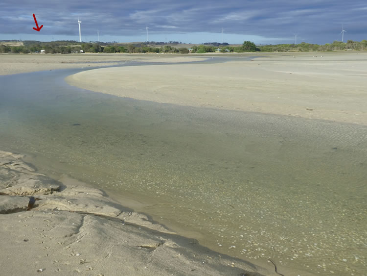 Tasmania Roadtrip - Week 8 - Little MusselroeWe decided to stay a few days as the weather seemed to be improving. We headed off for a walk at low tide so we could make our way across the shallows directly to the point. The red arrow shows our campsite. We were here at the right time as the campground is closed from May to November. Previous | Album | Next |