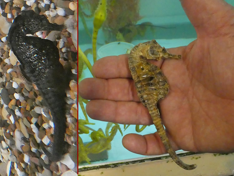 Tasmania Roadtrip - Beauty PointSeahorses can change colour to suit their environment. The one on the left has gone from yellow to black but they can also go red orange or silver. The guide at Seahorse World gave us this dead desiccated seahorse to pass around to look up close and to feel their skin. Previous | Album | Next |