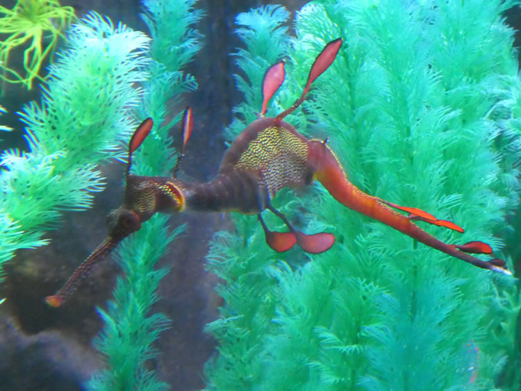 Tasmania Roadtrip - Seahorse WorldThis is a Weedy Seadragon. These and Leafy Seadragons are found in Tasmania and southern areas of Australia. Seahorses are found all over the world more commonly in tropical and sub tropical waters. Apart from the additional appendages that make it look like seaweed they don't have the curly tails of seahorses. Previous | Album | Next |
