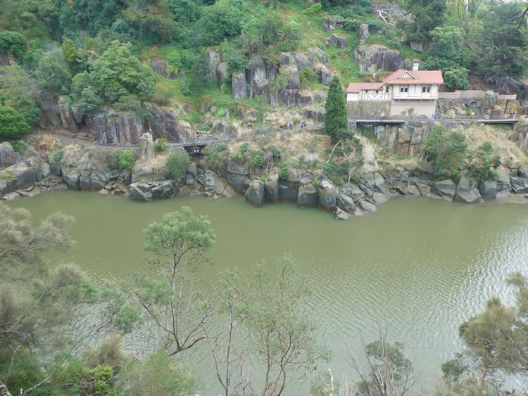 Tasmania Roadtrip - Cataract GorgeThere are a number of viewpoints overlooking the gorge from the Zig Zag Track. The building below is at the historic entrance to the Cataract Gorge Reserve. It is the Caretakers Cottage built in 1890 and the Toll House built in 1891. Back then it was 1 penny to enter Cataract Gorge. Previous | Album | Next |