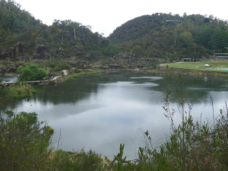 Tasmania Roadtrip - Cataract GorgeThe view across First Basin is quite pretty even though it is overcast today. We have been lucky that the rain has held off allowing us to complete the walk around both sides of Cataract Gorge. The chairlift crosses in front of us over some people swimming in the river and the pool. Previous | Album | Next |