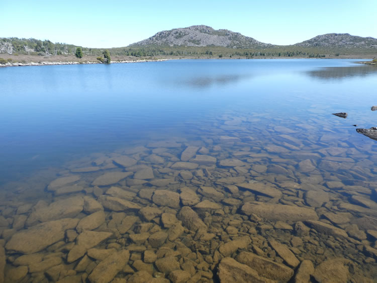 Tasmania Roadtrip - Highland LakesThere are some amazing photo opportunities at Pine Lake. We are looking towards the barren boulder-strewn Adams Peak at 1300m above sea level. We are standing at 1200m so it is quite cool even in the sun. The water is very calm and clear today but the weather can change suddenly. Previous | Album | Next |