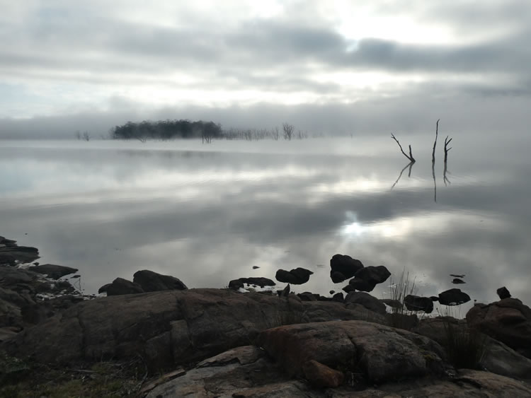 Tasmania Roadtrip - Arthurs LakeHydro Tasmania charges a minimal amount to camp on their land and it is very popular with boaties and fishermen. Looking out across the lake, sitting around a fire with wine in hand is our idea of a perfect evening. Then we woke up to this eerie but beautiful outlook. Previous | Album | Next |