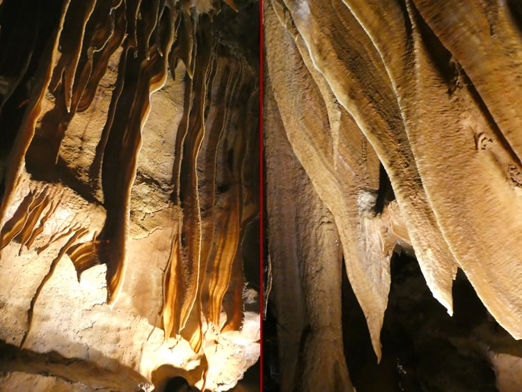 Tasmania Roadtrip - King Solomans CaveHere are some more flowstone formations 'Bacon' and 'Shawls' from King Solomons Cave. These are sheetlike deposits of calcite and other dissolved minerals that build up over time and create the various colours depending on the concentration of minerals at the time of formation. Previous | Album | Next |