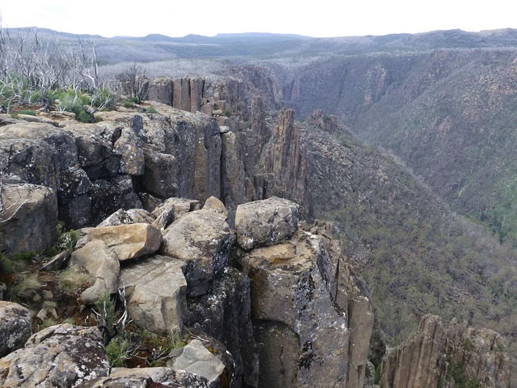 Tasmania Roadtrip - Devils GulletThis is the view to the east. You can see the path of the Fisher River as it winds its way through this steep, narrow glacial gorge. You cannot see any evidence of human existence anywhere. It feels like we are the only people in the world, it is such a remote part of the Central Plateau. Previous | Album | Next |