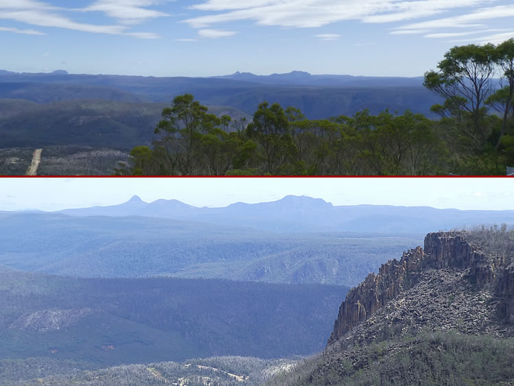 Tasmania Roadtrip - Central PlateauThose mountains off in the distance to the west are in Cradle Mountain - Lake St Clair National Park. Mt Ossa is the highest peak at 1617m and it is 35km 'as the crow flies' from Devils Gullet Lookout. Cradle Mountain is just shy of that height and easy to spot with its characteristic jagged peaks. Previous | Album | Next |