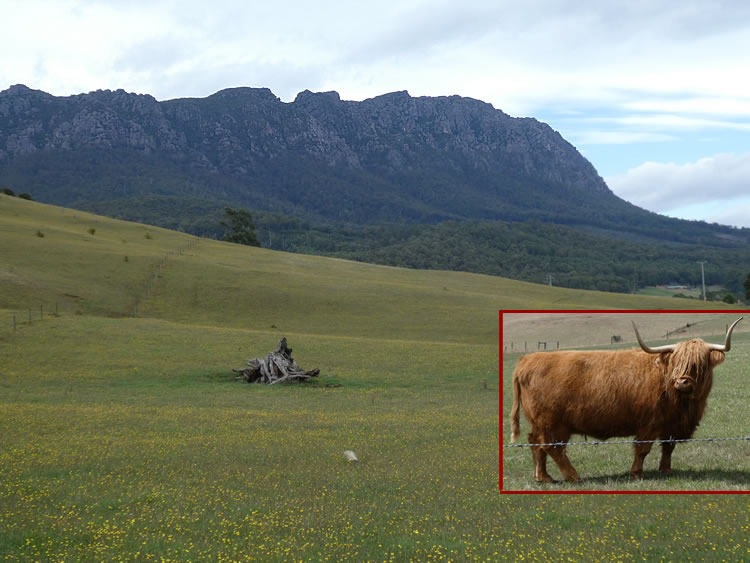 Tasmania Roadtrip - Mersey ValleyWe drove back into Mole Creek then continued north through the beautiful Mersey Valley with its views of the Great Western Tiers. A couple of Highland Cattle checked us out as we passed. They looked ready for winter with their long hair. Previous | Album | Next |