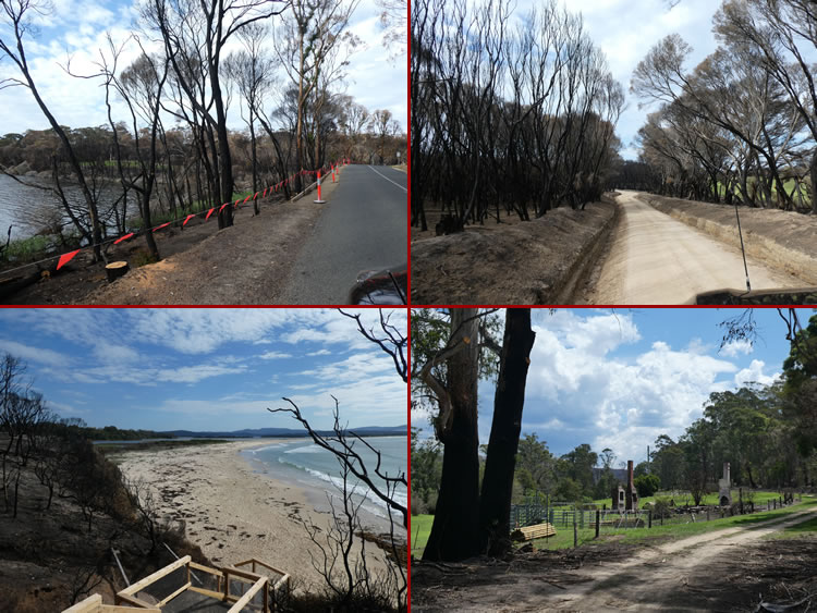 Tasmania Roadtrip - Week 11 - MallacootaIt is a very sobering drive through Mallacoota. Bottom left you see the new access stairs to the beach at Bastion Point have already been rebuilt. There are a lot of scenic drives and walking trails around the inlet, the lakes and beaches but many are closed at the moment due to fire damage. Previous | Album | Next |