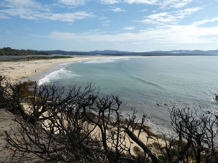 Tasmania Roadtrip - Week 11 - MallacootaFrom here we are looking across The Entrance towards Malacoota Inlet and the small islands named Goat, Rabbit and Horse. The black on the beach and in the water is ash. You can see smoke in the distance and helicopters dropping water on areas where fires are not still out months later. Previous | Album | Next |