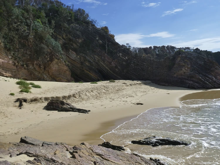 Tasmania Roadtrip - Week 11 - MallacootaAt least we could drive as far as Quarry Beach. The rocks here are amazing both near the carpark and also along the beach. These impressive ribbons of colour in the old sandstone cliffs are caused by repeated folding and faulting of the rocks over time. Previous | Album | Next |
