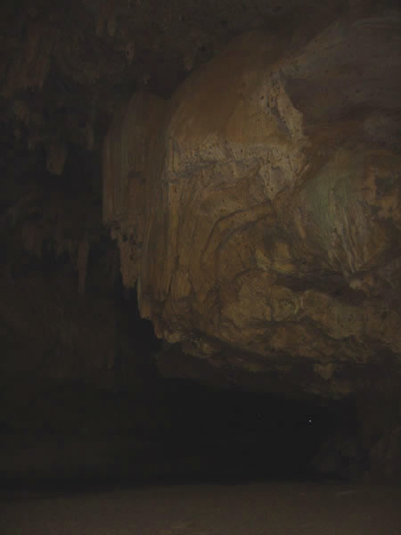 species of bats living in this cave (ghost bats and fruit bats) not that we can see them as it gets darker. A few more steps and we won't see much except by torchlight.