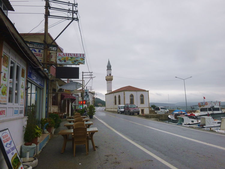 UK and Europe Roadtrip - KilitbahirThe sign says 'Kahvalti' which means breakfast in Turkey. This usually includes feta, bread, cucumbers, tomatoes and olives plus lots of brewed black tea. We were happy to give that a try! We had a view of the mosque and the marina while we ate. Select the photo below to see more of the coast around Kilitbahir. Previous | Album | Next |