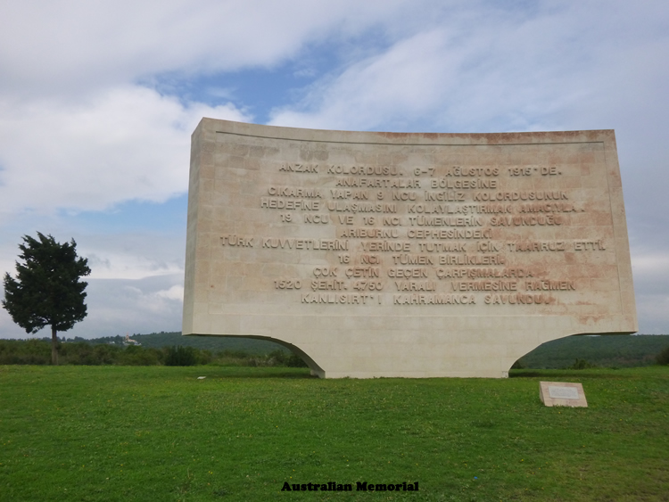 UK and Europe Roadtrip - Gallipoli PeninsulaThe Ataturk Memorial is at the north end of Anzac Cove with two very large monuments displaying conciliatory words about the heroes of both sides that shed their blood and lost their lives on the Gallipoli Peninsula. Select the photo below to see the other one. Previous | Album | Next |