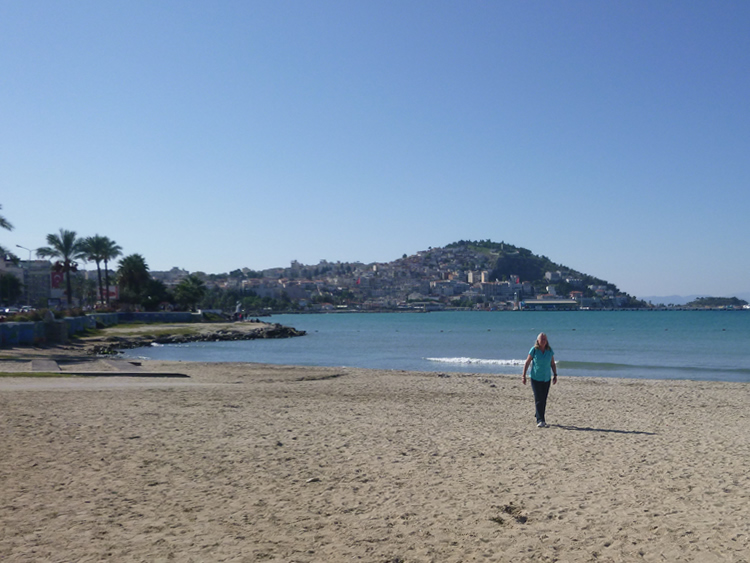 UK and Europe Roadtrip - KusadasiWe drove through the town of Kuşadası to a motel right on the beach but with views across the bay to the city. They allowed self contained motorhome camping (many do, just ask) for 30 Turkish Lira plus 10TL to use the washing machine. Bargain! Select the photo below to see tonight's sunset. Previous | Album | Next |