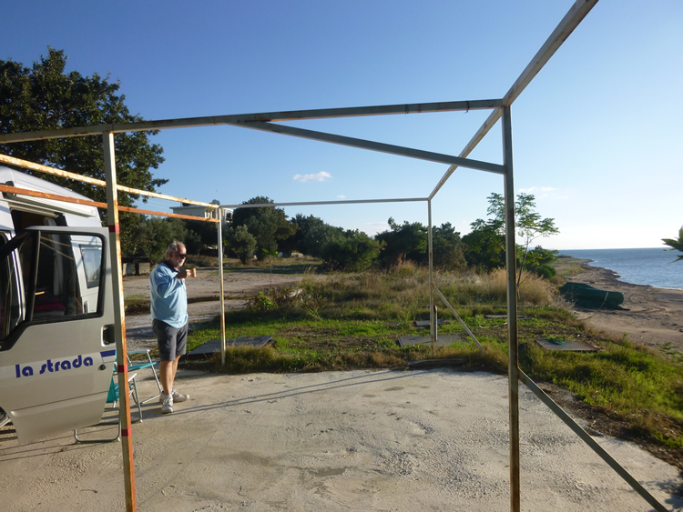 UK and Europe Roadtrip - Troas BeachWe were told of a free camp spot in the Troas Beach Hotel car park, right on the waterfront of the Ezine District. It is not the busy season so we had a choice of spots. We presume this metal structure once had a roof for market stalls in the tourist season. Select the photo below to see our view. Previous | Album | Next |
