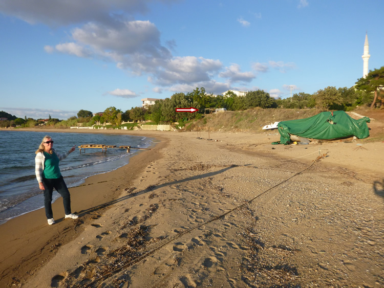 UK and Europe Roadtrip - Troas BeachA coffee and then we set off for a walk along Troas Beach and around the local fishing village of Tavaklı. The arrow shows our motorhome and how close it was to the minaret of the Tavakli Mosque. It might be an early start when prayers ring out in the morning! Select the photo below to see more. Previous | Album | Next |