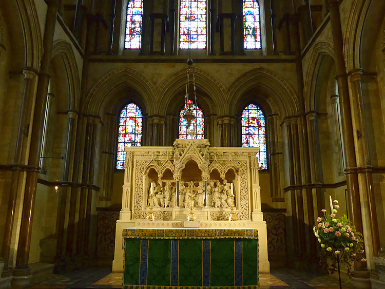 UK and Europe Roadtrip - Rochester CathedralWe walked passed the Quire, where only the monks were allowed to worship in the early days, and towards the High Altar. The Rochester Cathedral's interior is lit by over 50 magnificent 19th-century stained glass windows. This altar is ornate and quite beautiful. It is intricately carved stone with biblical figures and decorative elements. Previous | Album | Next |
