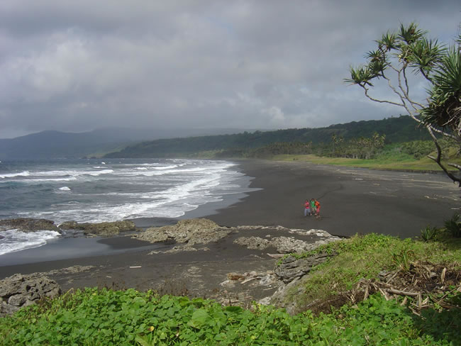Tanna Island, VanuatuThat is Mt Yasur in the background and as you can see the beaches are all black sand and pumice. We had a swim in the surf but didn't venture far out as it was pretty rough with rips. A freshwater creek flowed along the back of this beach and entered the ocean at this point which was great for a rinse off. Previous | Album | Next |