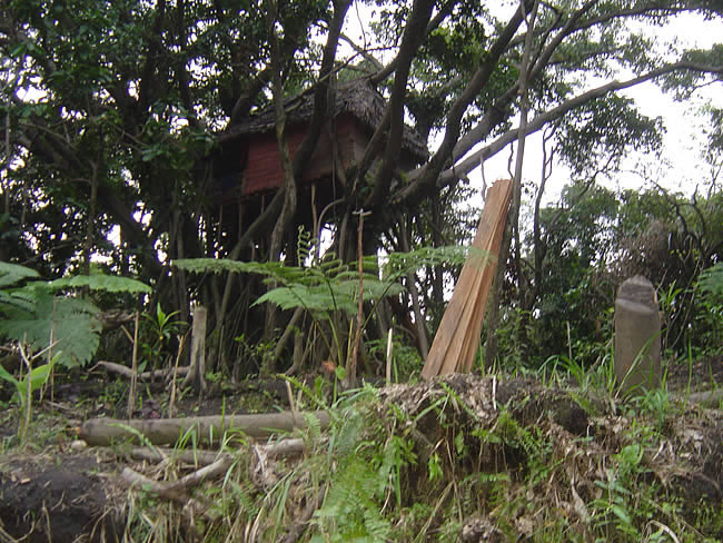 Tanna Island, VanuatuThe villagers all live in traditional huts which have bamboo walls and a palm leaf thatched roof. This area was flooded a few years back so I wonder if that is why they have built this one high in a tree. Other villages all seemed to be built at grouhd level. Previous | Album | Next |