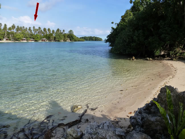 Oyster Island and Espiritu Santo Island, VanuatuTaxis meet all of the flights so we need not have arranged a transfer from the airport but being our first time here we didn't want to risk it. It was just over 30 mins drive north from Luganville on the south coast around the east coast to this lovely spot where we would cross over to Oyster Island. The rain clouds we saw upon arrival seemed to have disappeared and it was a beautiful day. Select the photo below to see the view back to this point from our hut (see arrow) on the other side. Previous | Album | Next |