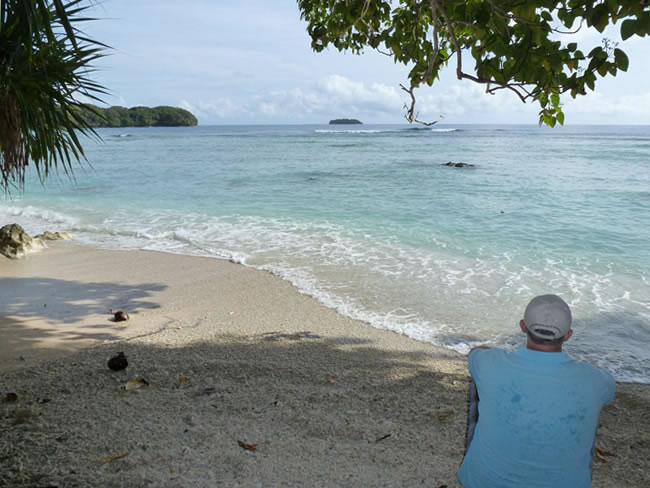 Oyster Island and Espiritu Santo Island, VanuatuNext morning we decided to walk across to the eastern side of the island (15 minutes walk!) to Sunrise Beach before breakfast. There are lots of beaches to explore around Oyster island connected by many walking tracks. The beautiful azure blue water was dotted with smaller islands close enough to kayak to. Select the photo below to see more of this lovely area. Light Breakfasts are included in the accommodation costs: a plate of fresh fruit (banana, papaya, pineapple, watermelon), unlimited toast, peanut butter, jam, coffee, tea, ‘juice’. You can also order hot breakfasts as well at an extra charge but we did not find that necessary. Previous | Album | Next |