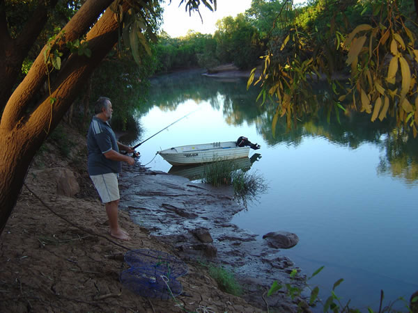 Victoria Hwy to Keep River National ParkGary & Pete gave the fishing a go just on sunrise (with a number of other hopefuls) but nothing... Even the 'opera house ' pots we put in the creek the night before didn't produce anything. Previous | Album | Next |