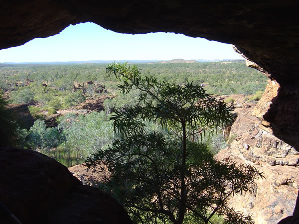 Victoria Hwy to Keep River National ParkOften you come across areas of rock that have been eroded to form a hole in the rock. They provide some shelter and often these are the places you would find aboriginal rock art. This one gave a nice view over the surrounding areas. Previous | Album | Next |
