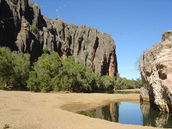 Windjana Gorge, The KimberleysFlocks of white corellas (similar to cockatoos) spent their time in the trees that lined the river at the start of the gorge. Every now and then something would set them off and they would all rise together into the air screeching and move to another set of trees - hundreds of them. An amazing sight. Previous | Album | Next |