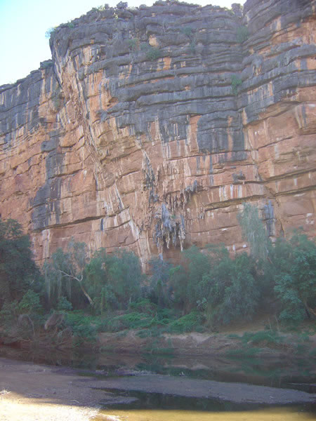Windjana Gorge, The KimberleysThe Lennard River runs through Windjana Gorge in wet weather, but forms pools surrounded by trees and shrubs during the dry season. The erosion continues as water constantly dissolves the calcium carbonate in the limestone forming stalactites as it drips out of cracks in the gorge walls. Previous | Album | Next |