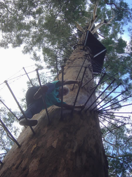 Karri Forests to Windy HarbourThe first rest platform is 25m up the karri tree (far enough for me) and the top platform is 75m above the ground. There are 135 climbing pegs and at the top the viewing platform can sway 1.5m in each direction. Previous | Album | Next |