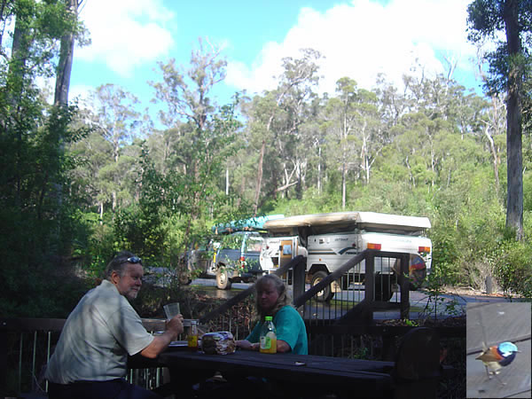 Karri Forests to Windy HarbourThe Karri can grow up to 90m high in good conditions making it one of the tallest trees in the world (Californian coast Redwoods grow up to 100m). We stopped for lunch at one of the picnic areas provided and we were visited by these tiny finches (see inset). Previous | Album | Next |