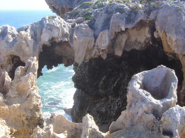 Windy Harbour , D'Entrecasteaux National ParkThe rocks are intriging, especially this formation called the Devil's Hole. Viewing platforms allow you to get right up next to the edge and look through the rocks to the ocean below. Have a look at the rocks up close. Previous | Album | Next |