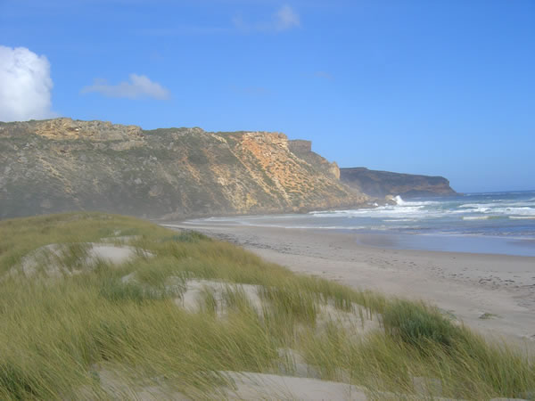 D'Entrecasteaux National ParkPete threw a fishing line in at Salmon Beach but it was very windy and overcast and no salmon were interested. The two lookouts from previous photos were on the clifftops shown here. You might be able to make them out in the photo. Previous | Album | Next |